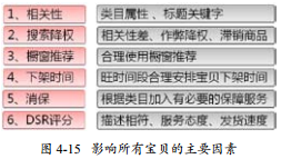 影響所有寶貝的主要因素有6個,相關性、搜索降權、櫥窗推薦、下架時間、消保、DSR評分,如圖4-15所示。
