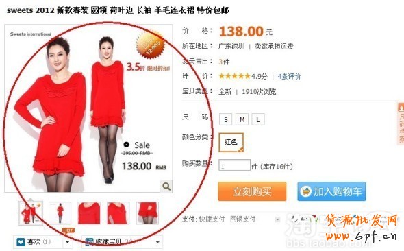上面已經提過了,淘寶買家的搜索習慣,就是標題和圖片,所以我們一張有視覺沖擊的圖片,可以提起買家的興趣,以至于來點擊我們的寶貝,主題圖片一定要新穎和清晰,一般采用的是800*800的正方形圖片,因為800*800的圖片,具有放大鏡功能,讓買家能清楚的看見圖片,圖片上的模特最好是放兩張,不同的表情和不同的衣服顏色,少了也不好,多了也不好,圖片不能出現(xiàn)水印,因為淘寶的活動是禁止圖片有水印的,比如促銷信息可以適當?shù)姆劈c,不要放得整個圖片都是的,因為買家看得是圖片,而不是文字。然后下面的四張圖片也要放滿,這四張圖片主要是展示我們的產品細節(jié)圖片。所以這個地方是很重要的一環(huán)。