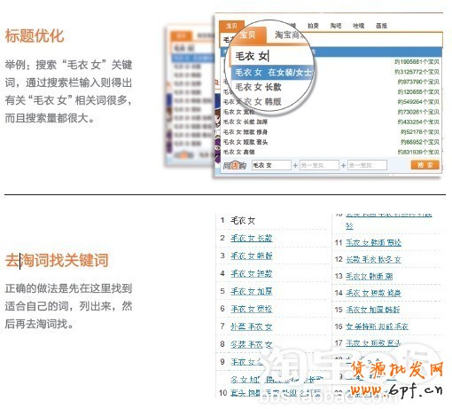 這些搜索出來的詞匯屬于搜索量大,并和產品不沖突的關鍵詞。其次把這些關鍵詞全部融入到一個寶貝標題里,可以看到組合的一個標題為:“正品 2011 冬裝新款韓版寬松 毛衣外套 中長款加厚高領套頭毛衣 女”。這個標題基本包含了前面至少25 個有效關鍵詞,因此總結出標題的要求是:關鍵詞要有搜索量、關鍵詞和產品本身匹配、標題要通順三個基本原理。本文來自于淘寶學堂網(http://www.tbxt.com,教你如何做淘寶店鋪優化)