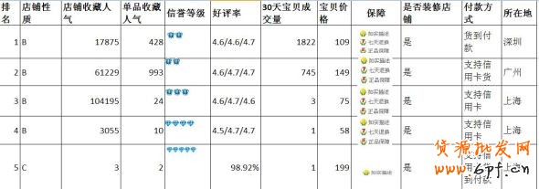 5.信譽(yù)等級(jí)和好評(píng)率仍然是硬指標(biāo)。信譽(yù)等級(jí)和好評(píng)率(或店鋪動(dòng)態(tài)評(píng)分)兩者的權(quán)重有所不同,前者的重要性比后者的大。搜索排名的結(jié)果一般都是皇冠在前,鉆石緊跟其后。表中有80%的店鋪達(dá)到了4鉆以上。好評(píng)率作為搜索排名指標(biāo)已經(jīng)不如以前重要了。分析其原因,應(yīng)該是淘寶認(rèn)識(shí)到個(gè)別差評(píng)和中評(píng)的出現(xiàn)并不代表店鋪服務(wù)品質(zhì)的低下。職業(yè)差評(píng)師和個(gè)別買家惡意差評(píng)不斷在擾亂網(wǎng)絡(luò)交易的公平性,如果淘寶搜索排名規(guī)則過(guò)份地強(qiáng)調(diào)好評(píng)率或店鋪評(píng)分,那么對(duì)很多C店和B店的賣家就是不公平的。表中排名第8的店鋪好評(píng)率只有96.23%,這對(duì)于那些剛剛開(kāi)店即遭遇差評(píng)的賣家無(wú)疑是一個(gè)好消息。