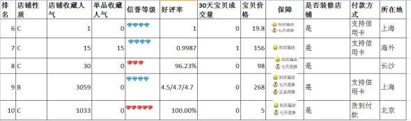 4.收藏人氣的作用似乎沒(méi)有其他人所說(shuō)的那么重要。表中有接近一半的店鋪和寶貝的收藏人氣很一般。另外,如果比較店鋪收藏人氣和寶貝收藏人氣,我發(fā)現(xiàn)前者的權(quán)重要大一些,從表中可以看出,排名前10的寶貝的收藏人氣沒(méi)有一個(gè)超過(guò)1000的。值得一提的是,現(xiàn)在刷收藏非常盛行,淘寶不應(yīng)該不知道這個(gè)現(xiàn)象,如果刷收藏能夠明顯提高流量,那么很多人都可以這么做,因?yàn)檫@樣做太容易了。我相信淘寶會(huì)對(duì)收藏人氣的權(quán)重有所考慮。