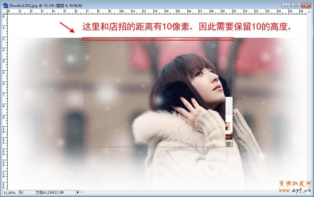 第十步:將復制的圖像粘貼到PS的背景海報里,讓它和背景圖像完全吻合后,進行裁剪,這樣處理的自定義圖片就能完美匹配背景圖像,同時需要注意,在制作前景圖像的時候,還需要在最上方預留10像素高度的空白區域,不然導入到自定義模塊后會變形,如下圖所示中,矩形框內就是我們準備裁剪導出的自定義前景圖像。