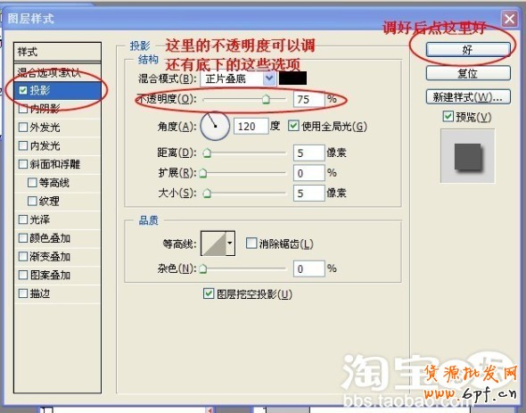 寫好文字,同樣用混合選項做投影。右鍵點擊相應的文字圖層,在彈出的選項框了點混合選項