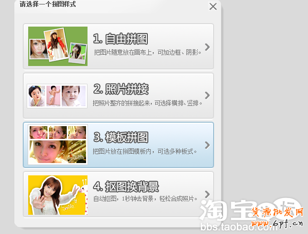 選擇好圖片之后點擊拼圖就可以看到選擇拼圖樣式,今天主要講用自由拼圖做橫幅型的廣告圖片,像模塊拼圖也很好用的哦!大家可以自己試試。