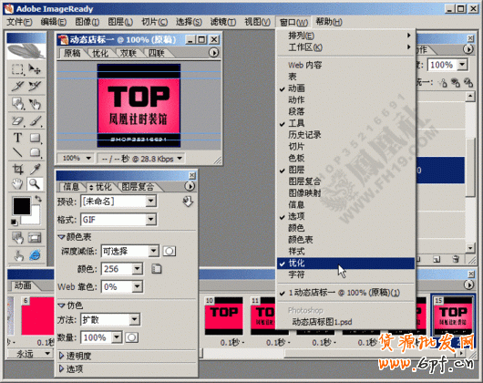 12.ImageReady是PS 捆綁軟件,界面大同小異,使用簡單,點“窗口”菜單調(diào)出“動畫”調(diào)板。配合圖層的顯示和隱藏,我們就能設(shè)計出漂亮的動畫。