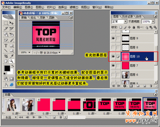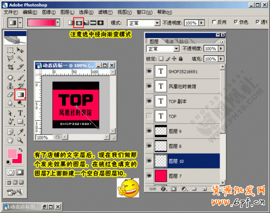 11.使用漸變工具徑向模式,注意拾色器調(diào)整出粉紅色前景色和桃紅色背景色,制作出發(fā)光效果的圖層10,所有準(zhǔn)備工作做好了點擊切換到ImageReady。