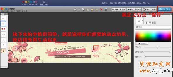 一切搞定,別忘了點保存!店招上可以顯示自己增加的動態(tài)效果了!扶植版不花錢照樣做出淘寶動態(tài)店招效果。
