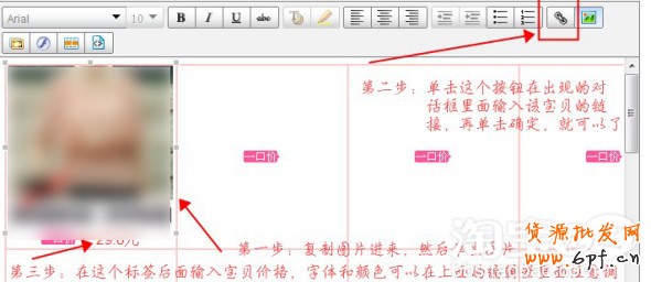 如下圖:先把圖片空間的圖片復制,然后直接在編輯框中間右鍵粘貼即可,粘貼后有時候會出現下面的動畫價格標簽跟在主圖后面,把模板給撐開了,這時只需要在主圖后面點擊一下,然后回車,那個小圖標就下來了。圖片放進來了以后我們再單擊它,會有個虛線框把它框起來,然后再點擊右上角的【超鏈接】按鈕,在彈出的窗口里面輸入對應的寶貝鏈接,確定。這樣別人點擊這個圖片就會馬上跳轉到相應的寶貝頁面。最后一步就是在那個閃動的標簽后面加上您的寶貝價格,讓別人可以同時看到更多的寶貝信息。