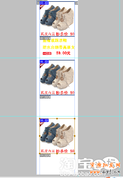 好了,分割好后,我們就要放入寶貝圖片了,我們將事先準備好的寶貝圖片拖動到相應的位置即可,對了,差點忘了,在標準版中首頁推廣頁面的寶貝圖片一般是160*160px,所以我們這里也把寶貝圖片調成同樣大小的像素,這樣看起來跟其他的比較匹配,當然大家也可以根據自己的喜好進行設置哦。我們把所有寶貝都拖到分割好的圖層中后,再每個寶貝下面可以利用文字工具輸入寶貝的名字和價格。