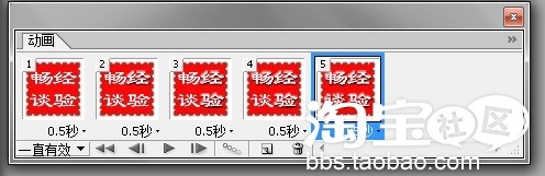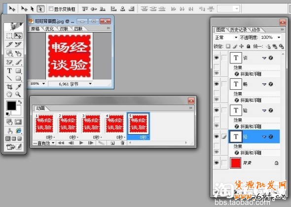 同樣道理,選擇第三幀,啟用“經”“驗”這兩個文字圖層的“斜面和浮雕”效果;選擇第四幀,啟用“經”“驗”“暢”這三個文字圖層的“斜面和浮雕”效果;選擇第五幀,啟用所用文字圖層的“斜面和浮雕”效果。經過這樣處理之后,就得到了五個不同的畫面,第一個畫面是平面效果,第二畫面是突出一個字,第三個畫面是突出二個字…