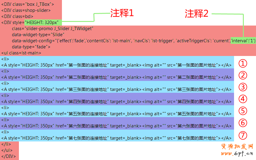①注釋1:用來改變你要的輪播模塊的高度,你只需把綠色部分的“320”修改成你要的數(shù)值就行了,其他的不管