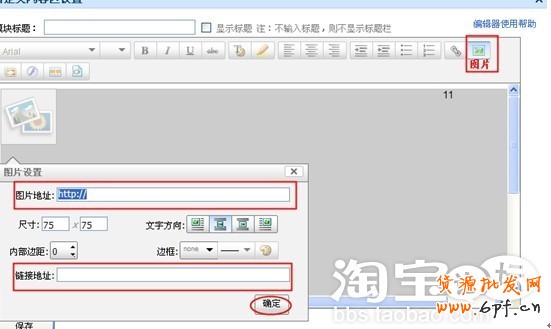 然后再這里輸入你上傳在圖片庫中對應的地址,同時把你寶貝圖片對應的店鋪地址也復制到這里,點擊確定就可以了,注意這里如果你原來設置的表格屬性與圖片不一致的話,你可以在上圖中的尺寸中重新設置你的圖片的大小,以調整跟你表格的大小一致。