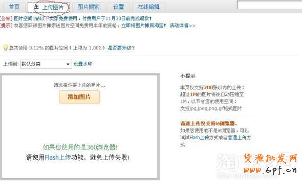 在此分類下,你還可以添加子分類,將寶貝分好類后可以為寶貝插入圖片,即點擊編輯圖片,在此大家要注意插入的圖片要事先上傳到圖片空間中,圖片空間現在免費為一鉆以下的用戶開放,你只要找好對應的寶貝圖片上傳到自己的圖片空間即可。圖片空間在 我是賣家→店鋪管理→圖片空間中,點擊上傳圖片,將設計好的圖片上傳到空間,