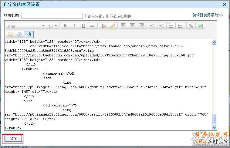 9、由于我們已經將促銷區的代碼制作完畢,因此在上圖中我們要將編輯器的編輯模式轉換成”編輯Html源碼”模式。這是很多沒有裝修經驗的朋友不注意的地方,也是容易出錯的地方。怎么轉換模式?只需要在上圖紅框位置處點擊一下就可切換。切換后如下圖所示: