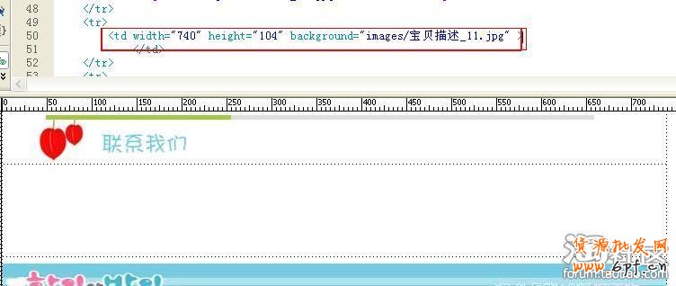 此時可以看到在屏幕下方出現單元格背景框。在背景框內填入images/寶貝描述_11.gif,并在左邊設置寬為740,高為104,設置完畢之后,刪除單元格中的圖片,也即刪除<img src= “images/寶貝描述_11.jpg” width = “740” height = “104” alt=””>這一段代碼。最終如下圖所示: