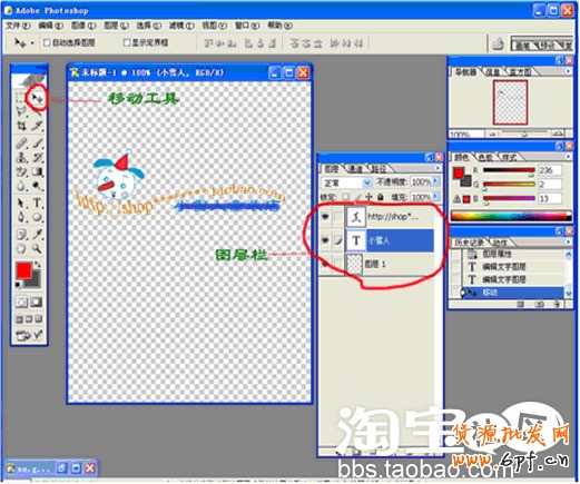 第九步:利用“第七步”和“第八步”方法輸入“店鋪名”并完成相應(yīng)的設(shè)置。下面在“圖層欄”(下圖紅圈所示)中點(diǎn)擊相應(yīng)圖層,然后再選取PS“工具欄”中的“移動(dòng)工具”分別將“小雪人”、“店輔網(wǎng)址”和“店鋪名”移動(dòng)到合適的位置,完成水印圖案的組合。(為了避閑,因此將圖例中的店名涂掉,有點(diǎn)影響視角效果請見涼!)如下圖所示: