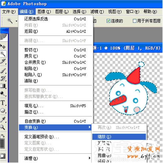 第六步:使用“第二步”中的方法將“小雪人”選中,再點(diǎn)擊“編輯”中的“變換”中的“縮放”,這時(shí)“小雪人”外面出現(xiàn)一個(gè)小方框(四邊都有“小方塊”,用來縮放),將鼠標(biāo)點(diǎn)住小方塊拖動(dòng),將小雪人縮小到適當(dāng)?shù)拇笮 H缦聢D所示:
