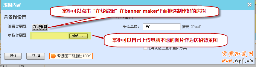 店鋪招牌是旺鋪所有版本通用模塊。所不同的是:扶植版、標準版店招店招的高度可以調整,區間:100-150(px)相素。拓展版、旗艦版店招的高度可以調整,區間:0-200(px)相素。(拓展版、旗艦版店招可刪。用自定義區代替。)