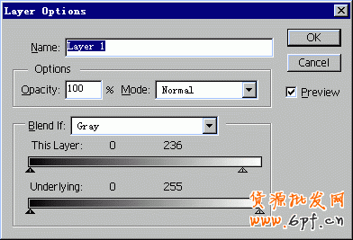 12、在面板中的“Layer 1”層上單擊鼠標右鍵,在彈出的菜單中選擇“Layer Option…”,在對話框中把“This layer”下的滑塊向左移動一些使值變為236,點擊“ok”按鈕制作完成。