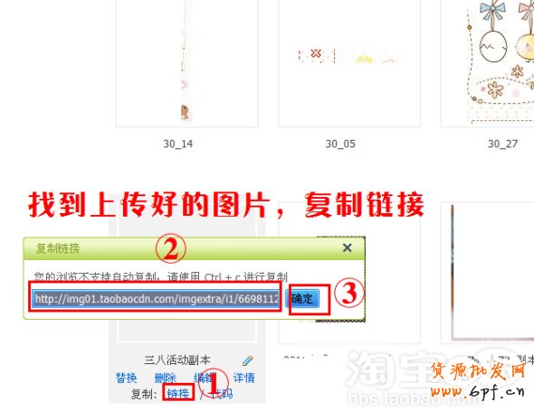 到淘寶免費提供的1G圖片空間里將圖片上傳。。(友善提醒:一鉆以前的“圖片空間”可以免費提供1G的空間哦,但是好像不接受外鏈,裝修店鋪的時候也是個可以利用的好地方~O(∩_∩)O。。)