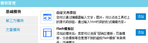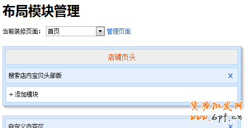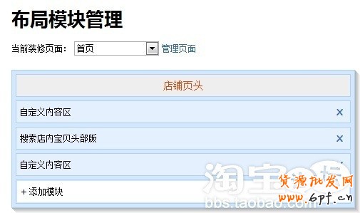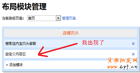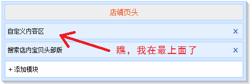 ③ 點擊添加,之后將你剛剛添加的自定義內容區移動到最頂端,使其變成圖六的布局樣式,弄完后就可以點擊頁面下面的保存按鈕了,之后就會自動跳轉至首頁裝修界面了