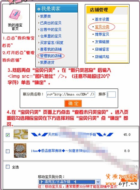 3.進入“管理店鋪”>“寶貝分類”,在“新的寶貝分類”中輸入代碼:<img src="圖片地址"/>。