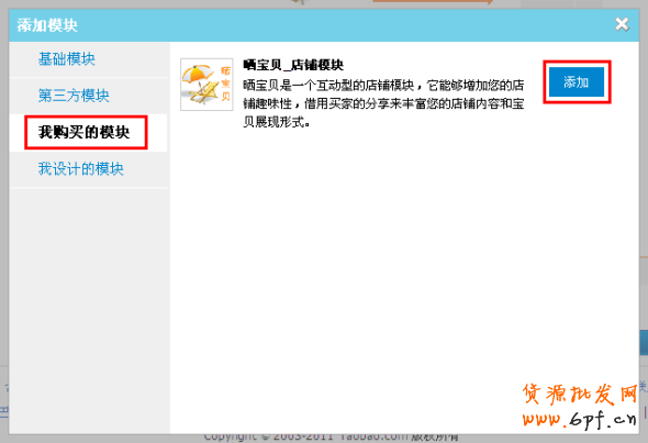 2.選擇“我購買的模塊”,找到曬寶貝_店鋪模塊,并點擊“添加”。