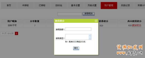 當得到獎勵的用戶需要使用積分時抵消Ta在你的店鋪新買到的寶貝時,Ta需要通過旺旺聯系你,你需要到管理后臺-用戶管理中,搜索出這名用戶:然后點擊“使用積分”,減去相應的積分,然后再手工修改TA的訂單金額即可。