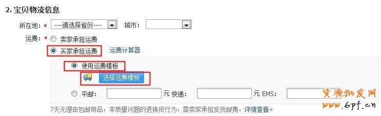 1)寶貝發布頁面,選擇“買家承擔運費”-“使用運費模板”-“選擇運費模板”: