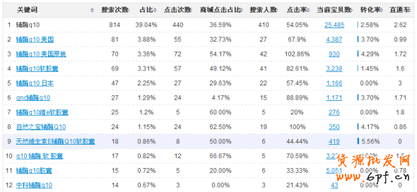 僅僅搜索“輔酶Q10”衍生出來的相關關鍵詞多達446個。結合全面的數據,不僅僅是直通車的關鍵詞,寶貝標題、產品賣點也從而得到了更多的參考。