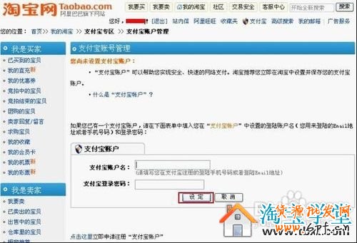 點(diǎn)我的淘寶—支付寶專區(qū)—您還沒有設(shè)置您的支付寶賬戶(點(diǎn)擊設(shè)置)來設(shè)定支付寶賬戶。