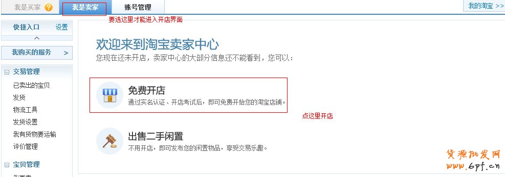 1、登陸淘寶,(沒有賬號的可以看我們的教程,如何注冊淘寶賬號)并進入我是賣家界面,然后點擊免費開店