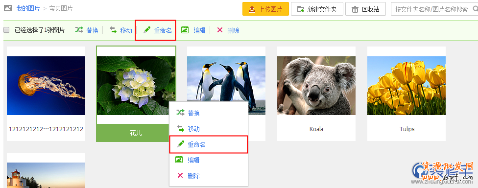 方法二:用戶選中圖片后,在導航欄上有“重命名”功能鍵,鼠標右鍵有“重命名”功能鍵;