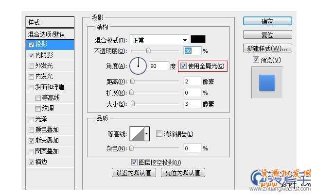 當光源在90°的時候高光、陰影以及其他圖層效果看起來最好。為了避免重復設置,在混合選項中(斜面和浮雕、內發光和陰影)勾選使用全局光。