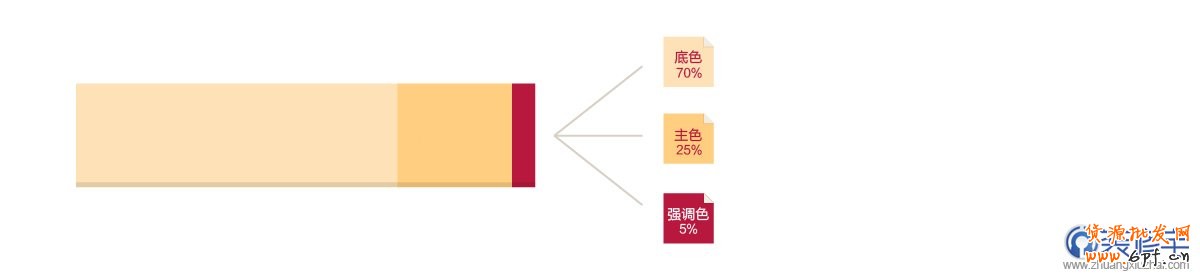 色彩的搭配方法有很多種,這里介紹一種我個人比較認同的方式。日本設計師まりっぺ提出70%,25%,5%的配色比例原則,畫面中70%為底色,面積最大的一塊,往往畫面的色調是有底色決定的。25%面積的為主色,畫面的核心區域多使用主色區。5%為強調色,強調色在畫面中起到華龍點睛的作用,強調色多使用與主色對比度較大的顏色,也可以嘗試利用色彩的互補關系來突出。