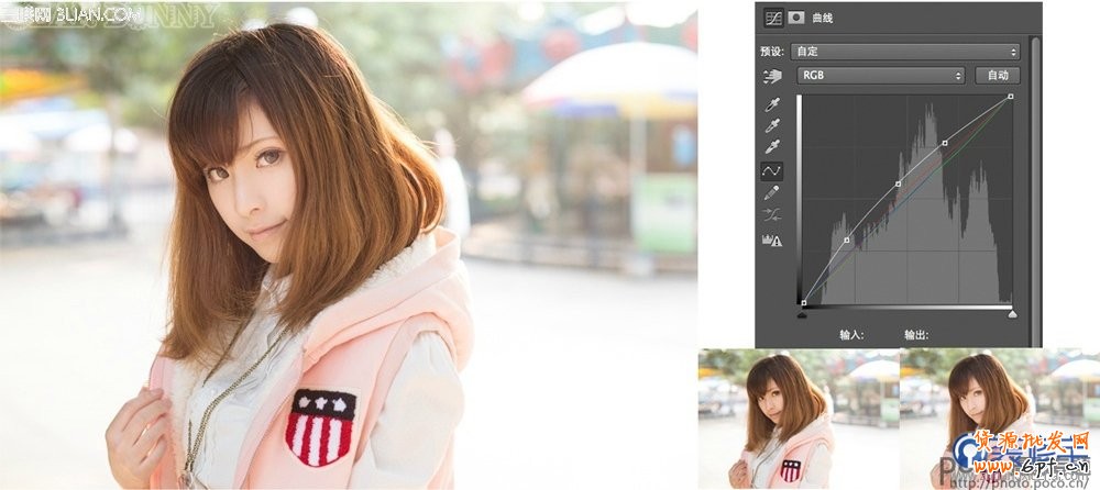 曲線如圖拉,后面3個顏色的曲線沒有顯示因為那是屬于調色的,對于不同圖片不同調法,這個方法是直接變亮沒情說的亮亮暗暗全部一起變亮。如圖顯示的5點我們先忽略最高與最低,剩下3點中間可以理解為中間的光亮,上方的可以理解為光亮部分那下方必然就是暗的部分啦,RGB中往上拉是變亮不說了自己玩玩就有了。