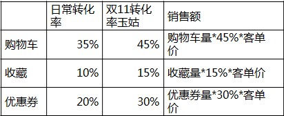 去年2013年收藏+購物車+優惠券占到雙11總成交的42%,根據2014年日常成交、年中大促或8.28數據,分解購物車、收藏和優惠券需帶來的銷售額,并計算出所需的購物車、收藏量和優惠券量,再分配到重點預熱期中的每一天。
