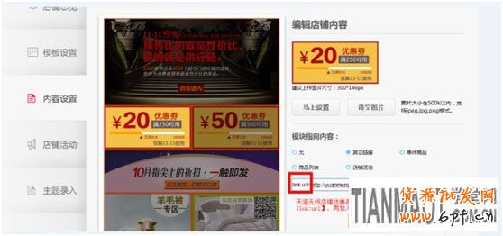 推廣應用方法二:天貓無線店鋪裝修 (tw.tamll.com)。在內容設置里面添加鏈接