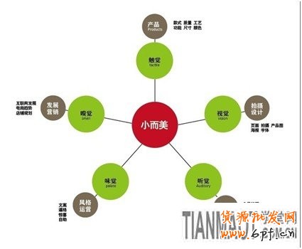 首先,小編把小而美的有特色,歸結為人體的五個感官方面,即“觸覺”、“視覺”、“味覺”、“聽覺”、“嗅覺”有特色,觸覺對照的是“產品”,視覺是“設計”,味覺是“風格”,聽覺是“CRM口碑”,嗅覺是“發展趨勢”。分清了這幾大方面后,我們就可以開始研究,自己的店鋪應該要在哪個方面比較有優勢。從而做到點對點的發力,以點帶面,一舉突破重圍。