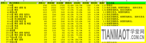 準備工作完成,接下來需要先按三個數據項單維度選出我們的數據,依次是:成交指數,轉化率,搜索指數(為什么選擇依次選擇這3個數據,大家回頭去看文章前面的優化標題的三個目的就明白,還有,你有沒有發現這三個數據的關系?再看看……對!成交指數=搜索指數*轉化率,我們需要按照單一維度選擇然后再綜合分析,是不是想到了物理中的控制變量法:)