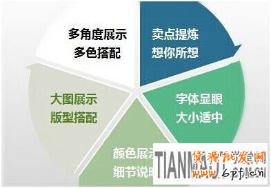 除了關鍵詞,接下來就是做好的就是寶貝描述了。一個好的寶貝詳情頁,最重要的就是簡明扼要,讓人輕松看完,讓買家找到自己想看的內容,解除買家的后顧之憂。在這里一般包括幾個重要的元素:產品關鍵詞、促銷海報、寶貝功能結構介紹、尺碼規格、實物細節圖、物流和售后服務承諾等。但在產品信息展示設計里,一定要注意兩點:(1)文字精簡清晰 (2)圖文重點突出 。寶貝描述最后可以帶上關聯銷售產品鏈接,盡量不要放在前面。