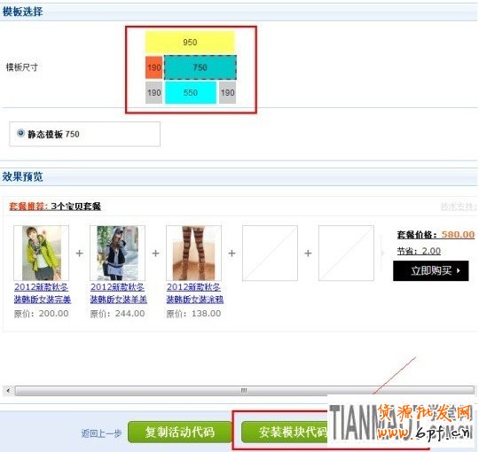6、選擇合適模板尺寸,預覽效果,點擊【安裝模塊代碼(寶貝詳情頁)】