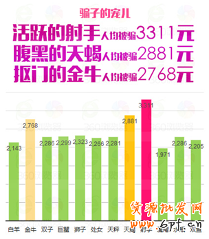 該報告分析,射手座和天蝎座的用戶受騙金額位居前兩位,分別為3311元和2881元。從星象學的角度分析,坦誠的射手座一向大條,即使被騙,除了當下會破口大罵外,一轉身,隨即忘得一干二凈,所以即使是同樣的手法,射手座依然能夠被詐騙數次。