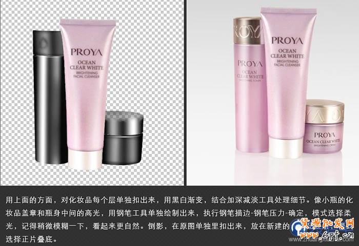 像小瓶的化妝品蓋章和瓶身中間的高光,用鋼筆工具單獨繪制出來,執行鋼筆描邊-鋼筆壓力-確定,模式選擇“柔光”,記得稍微模糊一下,看起來更自然。倒影,在原圖單獨里摳出來,放在新建的化妝品底層,模式選擇“正片疊底”。