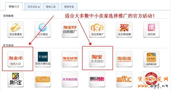 3、點擊后,即可到達”營銷入口“,開始進入我們的主題:如何報名“淘金幣”、“天天特價”等活動。