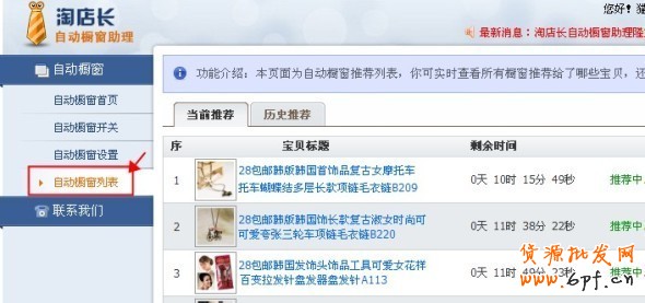 這樣自動櫥窗推薦就自動地運行起來了,我們可以通過【自動櫥窗列表】來觀察哪些寶貝被軟件推薦上了櫥窗位哦,如圖:
