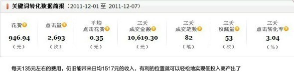 首先對于關鍵詞少,但是競爭激烈的行業,在200元以內的預算中用直通車推廣達到一個很好的投入產出比相對有點困難。但是做到維持店內人氣或者讓推廣產品實現直通車微盈利還是有可行性的。