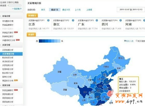 在這張圖里面,我們可以排名前5的省份。這些省份目前是主力軍,在下面的地圖里面已經以熱圖的形式把買家的地域分布都表示出來了,可以用肉眼查看得到顏色越重,說明買家越集中!我們要針對性的去大力推廣。效果比大面積撒網會好很多!