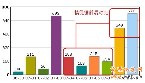搞了這個促銷活動后,銷量有沒有增加呢?同樣貼出我店鋪搞了促銷活動前后的銷量數據對比圖