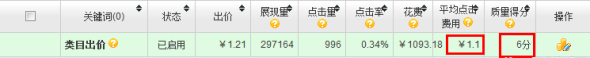 當一款寶貝的總體點擊率很高,里面的所有關鍵詞質量得分都很高。我用的方法是利用關鍵詞的點擊率,提升定向的質量得分。下面看圖: